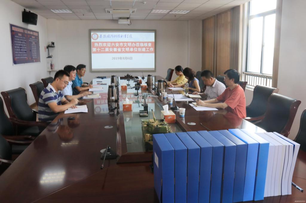 本网讯 根据《六安市关于开展第十二届安徽省文明单位推评工作的通知》,beat365积极开展了申报省第十二届文明单位相关工作。8月6日下午,由六安市文明办、市直工委相关人员组成的核查组一行4人莅临beat365检查省第十二届文明单位创建工作,beat365党委书记余嗣元,党委委员、宣传(统战)部长、思政部主任袁旗及党政办、宣传部相关人员参加。 会上,余嗣元向核查组一行介绍了beat365近年来文明创建工作取得的成绩。余嗣元表示,近年来,学校坚持立德树人根本任务,大力践行社会主义核心价值观,科研和人才培养水平进一步提高,各级各类职业大赛摘金夺银;社会服务能力进一步增强,创城、扶贫、志愿者等工作屡受好评;校园军工文化特色鲜明,道德讲堂和传统节日系列活动成效显著,学校的社会满意度和社会口碑达到新的高度,2017年荣获省第十一届文明单位。成绩的取得与六安市的飞速发展和市委市政府的大力支持是分不开的,他希望六安市委市政府继续一如既往的支持学校发展和建设。