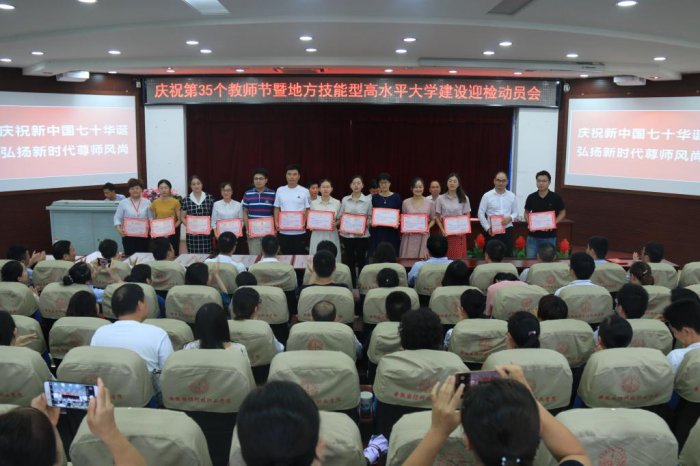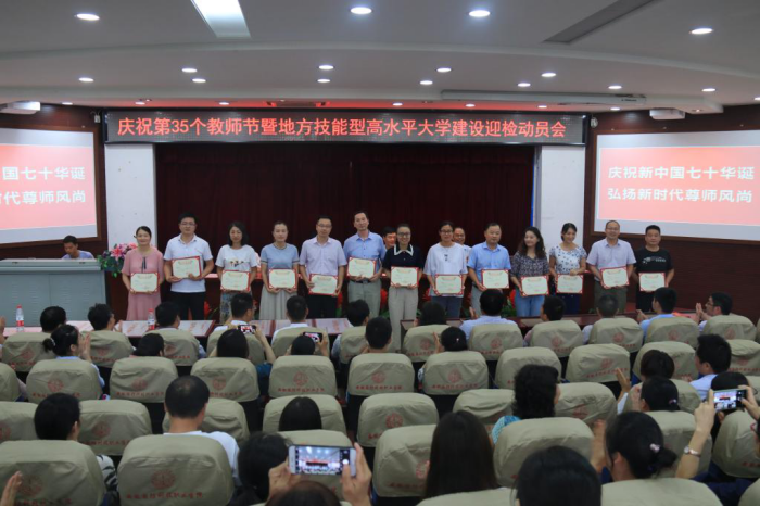 本网讯 庆祝新中国七十华诞,弘扬新时代尊师风尚。在举国上下喜迎新中国70周年华诞之际,我们迎来了第35个教师节。9月7日下午,beat365在图书馆报告厅隆重召开庆祝第35个教师节表彰暨地方技能型高水平大学建设迎检动员会,校领导余嗣元、李麟书、朱德明、冯伦久、丁守宝出席大会。会议由校党委委员、副校长丁守宝主持,全体教职工参加了表彰大会。