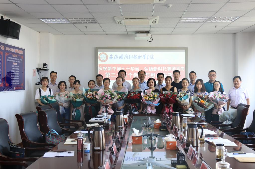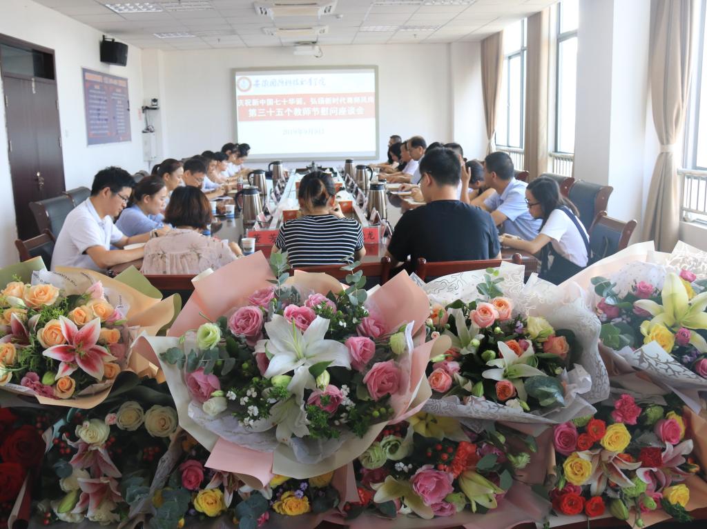 本网讯(组织人事处 孙佳)金菊溢彩,丹桂飘香。在第三十五个教师节和中秋佳节来临之际,9月9日下午,学校在秉心楼第一会议室召开了以“庆祝新中国七十华诞,弘扬新时代尊师风尚”为主题的教师节慰问座谈会。校长李麟书、党委副书记朱德明、副校长丁守宝、组织人事处处长付贤政及教职工代表参加了座谈。会议由副校长丁守宝主持。