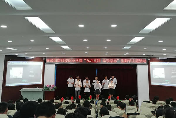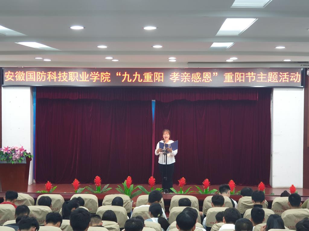 同学们以饱满的热情、悦耳的歌声向老师们、同学们展示出青春的风采,唱出对父母长辈的感恩。参会人员集体观看了视频《关爱老人,关爱父母》,视频中真挚感人的故事让人动容,全体参会人员进一步加深了对“感恩”内涵的理解。接着,由各二级学院推荐3名学生参加重阳节诗歌朗诵大会,他们分别以关注重阳、孝亲敬老、感恩情怀为主题,朗诵了他们自己选出的诗歌,《重阳.献给妈妈的歌》、《采桑子·重阳》、《尊老敬老,学会感恩》、《岁岁重阳,今又重阳》……学生们诵读风格各异,有的生动活泼,有的深情吟咏,有的顿挫有力。不一的风格,却共同展现着中华文化的深厚底蕴与魅力,传承着炎黄子孙登高望远、敬老爱友、孝亲感恩的古老传统。