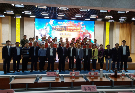段庆文同学登台领奖并与大赛评委和选手合影留念