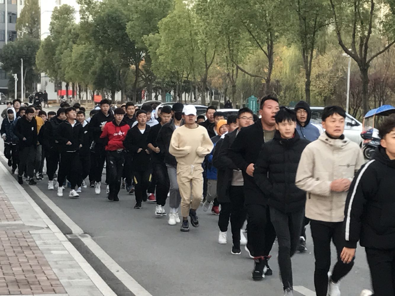 每天早晨6:40,在院学生会文体部同学们的组织下,学院18级、19级二百多名同学学校食堂门口迅速集合列队。随后,在执旗手的带领下全体同学排成两列纵队沿着学校环形跑道准时开跑。大家矫健的步伐,响亮的口号,充分展现了汽车技术学院学子们朝气蓬勃的良好精神风貌,这已然成为深秋的校园里一道靓丽的风景线。