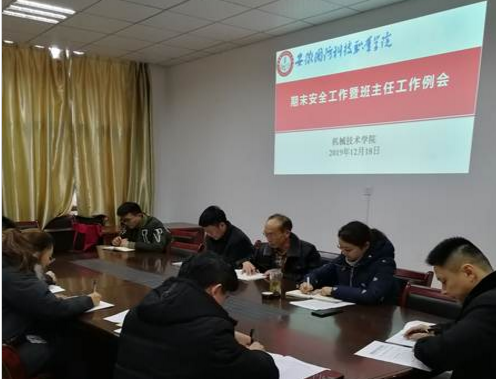 本网讯(机械技术学院 张艳华) 为促进期末安全工作平稳开展,同时布置放假前后有关学生工作,12月18日下午,机械技术学院召开期末安全工作暨班主任工作例会,会议由院党总支副书记陈思主持,院党总支书记张宗江、院长黄祥及全体辅导员和18、19级班主任参加了会议。