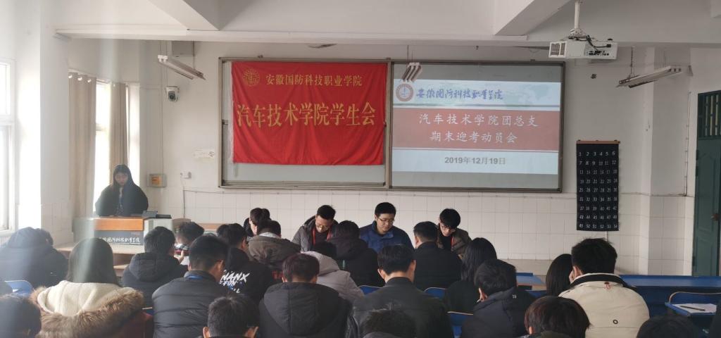 本网讯(汽车技术学院 朱其阳)为了进一步加强学风建设,营造良好的期末复习和诚信迎考氛围,12月19日中午12:00,汽车技术学院团总支学生会在2教205召开2019-2020学年第一学期期末复习迎考动员大会。汽车技术学院辅导员朱其阳出席会议,全体学生干部按时参加会议,会议由院学生会主席李栋主持。