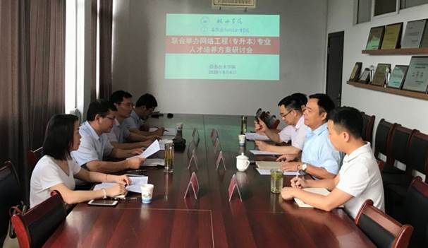 本网讯(信息技术学院 李剑峰)6月4日下午,皖西学院电子与信息工程学院院长符茂胜、副院长郁书好等一行4人到beat365就联合举办网络工程专业事宜进行专题研讨。信息技术学院院长黄存东、校组织人事处长付贤政等参与了研讨和交流。