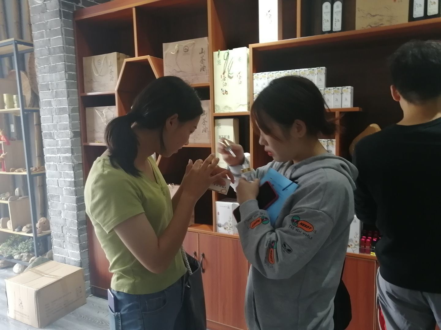 师生一行首先前往公司产品展示厅参观、了解油茶系列产品,同学们饶有兴致的体验了部分产品的生产制作过程,展厅许经理与同学们进行交流并对同学们感兴趣产品成分及功效问题进行详细解答;随后,一行又前往公司油茶种植基地,实地参观了万亩油茶园,许经理向同学们详细介绍了公司创业、发展历程并详细展示油茶果使用价值。