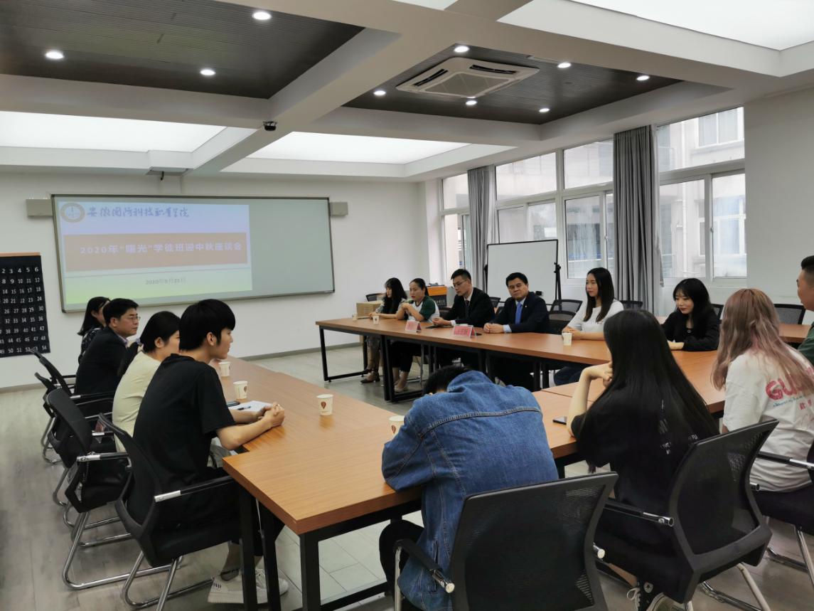 本网讯(经贸管理学院 司首婧)月到中秋分外明,人到佳节别样亲。9月25日下午,传统节日中秋节来临之际,经贸管理学院、六安曙光铂尊酒店在实训楼403室联合召开2020年酒店管理专业“曙光”学徒“中秋”慰问座谈会。六安曙光铂尊酒店总经理王正跃、人力资源总监解凌云、经贸管理学院党总支书记杜先扬、院长杨力、酒店管理专业教师司首婧、郭艳秋及十余名酒店管理专业“曙光”学徒班学生参加座谈会。座谈会由司首婧主持。