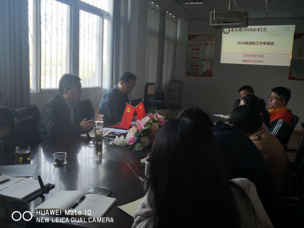 本网讯(经贸管理学院 李文君)10月9日下午,根据学校工作部署,经贸管理学院召开2020级迎新工作专题会议,对相关工作进行再部署,院党总支书记杜先扬、校企合作专业企业代表及全体2020级辅导员、班主任参加会议,会议由院党总支副书记刘峰主持。