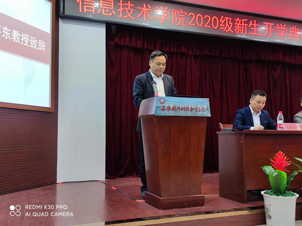 议程第二项,校党委委员、信息技术学院院长黄存东教授致辞。黄院长代表全院师生员工对新同学的到来表示热烈的欢迎。他从发展历程、师资、专业、校企合作、教学成果、技能大赛、就业前景、团学活动等层面对学院作了详细而具体的介绍。信息技术学院优秀的教学团队、国家级的骨干建设专业、先进的教学设施、专业齐备的实训场所,以及与中兴通讯、科大讯飞、伟创聚赢等企业开展深度合作特色专业共建班,让每位学子都能学有所获,学有所成。最后,黄院长对同学们提出了三点希望,希望同学们拥有“勤学善思”的心态、“披荆斩棘”的准备和“踏实奋进”的行动。从今天起,从现在做起,以德为先,学好专业知识,掌握实训技能,在丰富的实践中经风雨、增见识、长才干、锤技能,让青春在奋斗中绽放,让人生在奋进中奔跑!