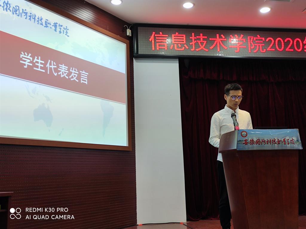 议程第四项,2020级新生代表邱国华同学发言。她难掩激动之情,表达了这几天入学的感受。并代表全体新同学郑重承诺:一定恪守“厚德 强能 励志 笃行”的校训;严守校纪校规,勤奋刻苦学习,用青春诠释曾经的誓言,用汗水铸造明日的辉煌;做一个特别能吃苦,特别能战斗,特别能攻关,特别能奉献的当之无愧的国防人!