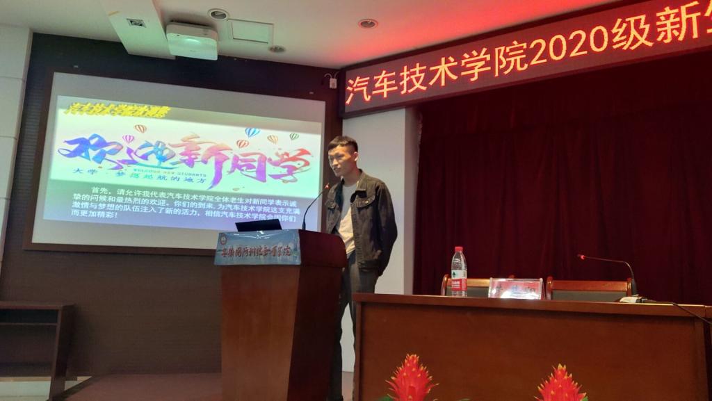 学院介绍时,汽车技术学院党总支副书记余桂刚代表汽车技术学院全体师生对新入校的2020级新生表示热烈的欢迎,并对即将开始大学生活的全体2020级新生寄予了真诚的祝福和殷切的希望,同时就学校和汽车技术学院的情况进行了详细的介绍。