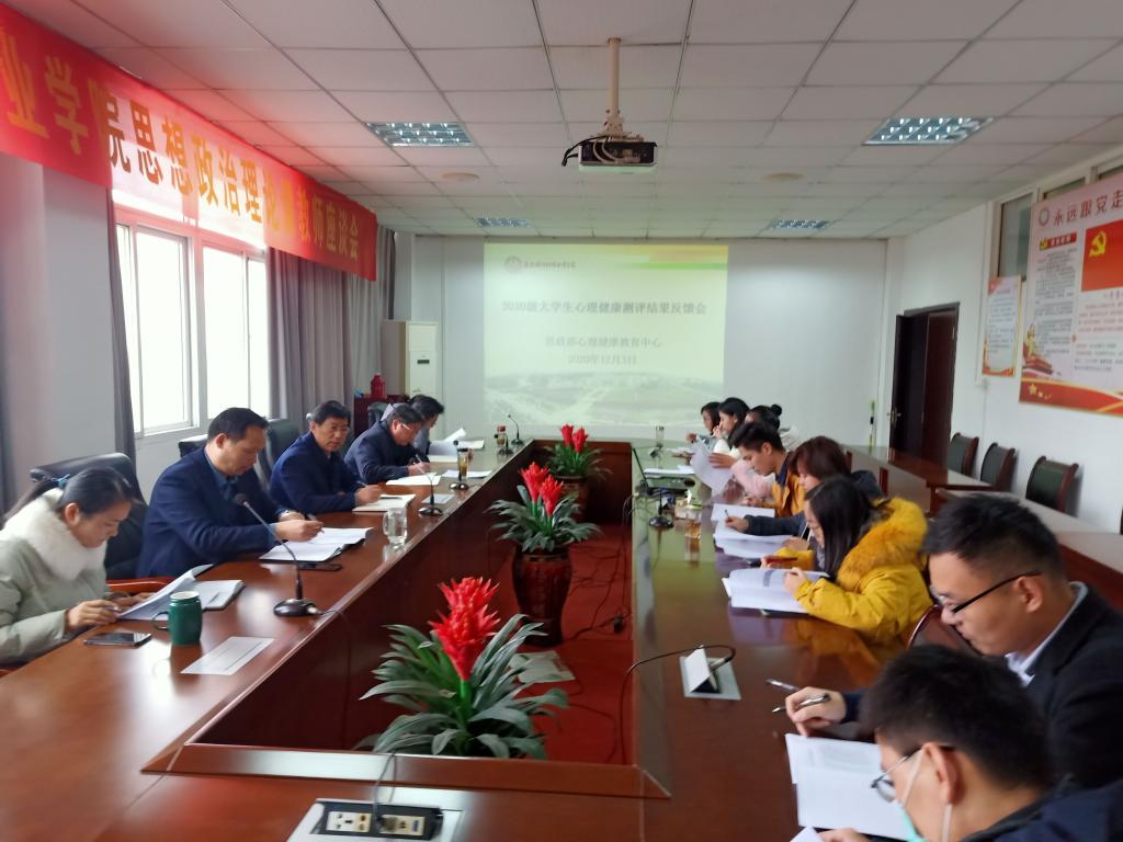 本网讯 12月3日上午,思政教学部在知行楼403会议室召开了2020级大学生心理测评结果反馈会,会议由校党委委员、宣传部部长、思政部主任袁旗主持,各二级学院副书记、心理辅导员和心理健康教育中心工作人员参加了此次会议。