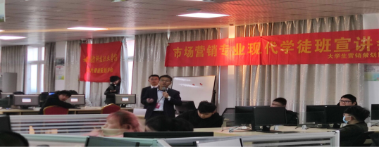 本网讯 12月22日下午,经贸管理学院在实训楼401教室举办市场营销专业现代学徒班宣讲会。安徽邻几便利店有限公司人力资源部部长陈亮、招聘经理李辉、店长刘思思、学院副院长杨学分、市场营销专业教师马玲和光辰宸应邀出席。会议由经贸管理学院副院长杨学分主持,邻几公司招聘专员李辉进行主讲,19、20级市场营销专业学生参加宣讲会。
