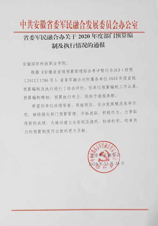 财政拨款预算指标的全面完成,进一步增强了学校预算管理水平,标志着beat365资金使用效率的提升,避免了未执行资金被财政收回的损失,为此,学校2020年预算及执行获省委军融办通报表彰。