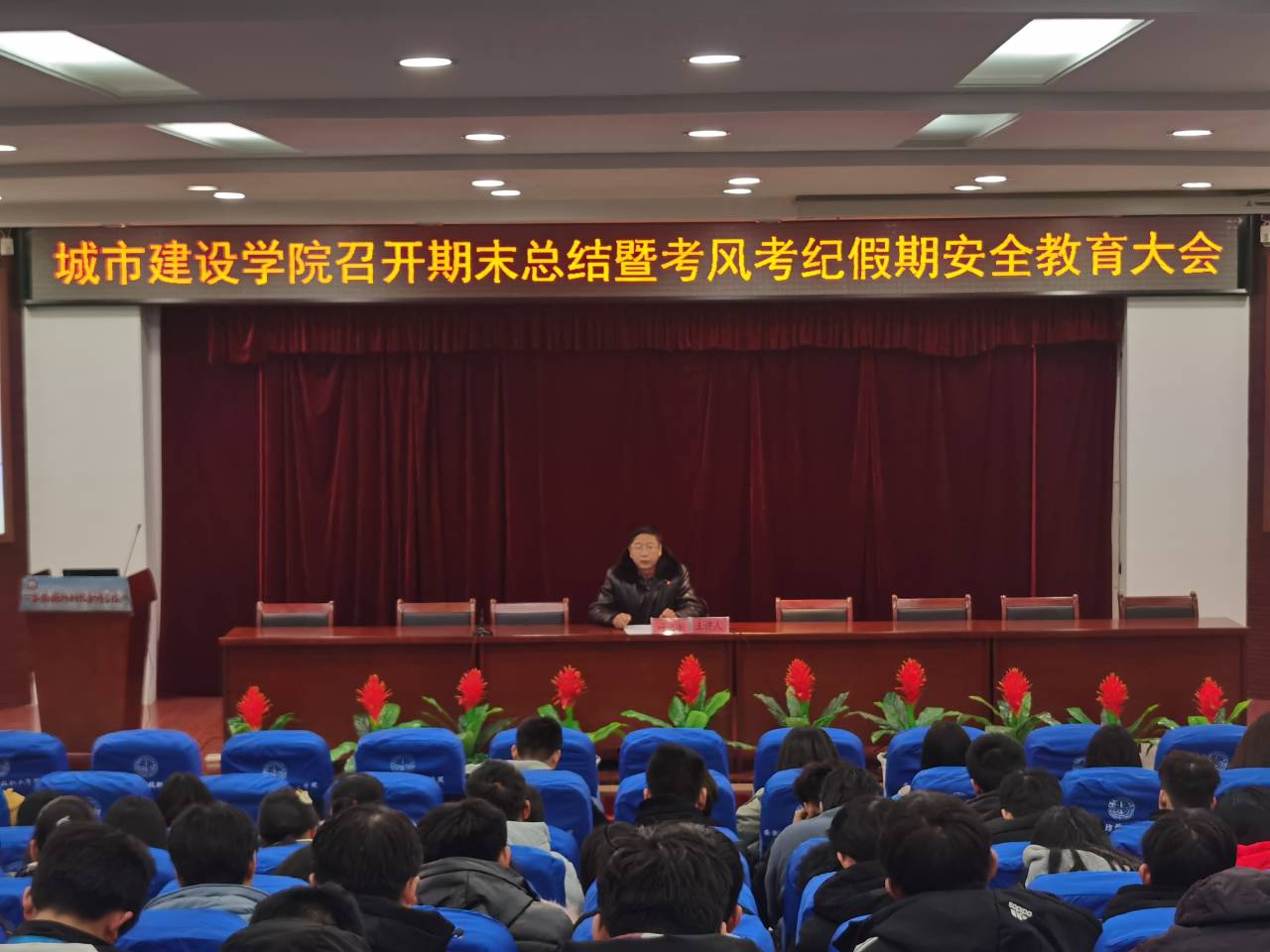 本网讯(城市建设学院 罗丞筠)为进一步严肃考风考纪,树立学生诚信考试意识,贯彻落实学校关于学生假期安全方面的相关要求,提醒学生做好疫情防护工作及自我保护,城市建设学院于2021年1月6日下午在图书馆报告厅召开期末总结暨考风考纪假期安全教育大会。本次会议由学院党总支副书记叶启衡主持召开,城市建设学院19、20级全体学生干部参加。