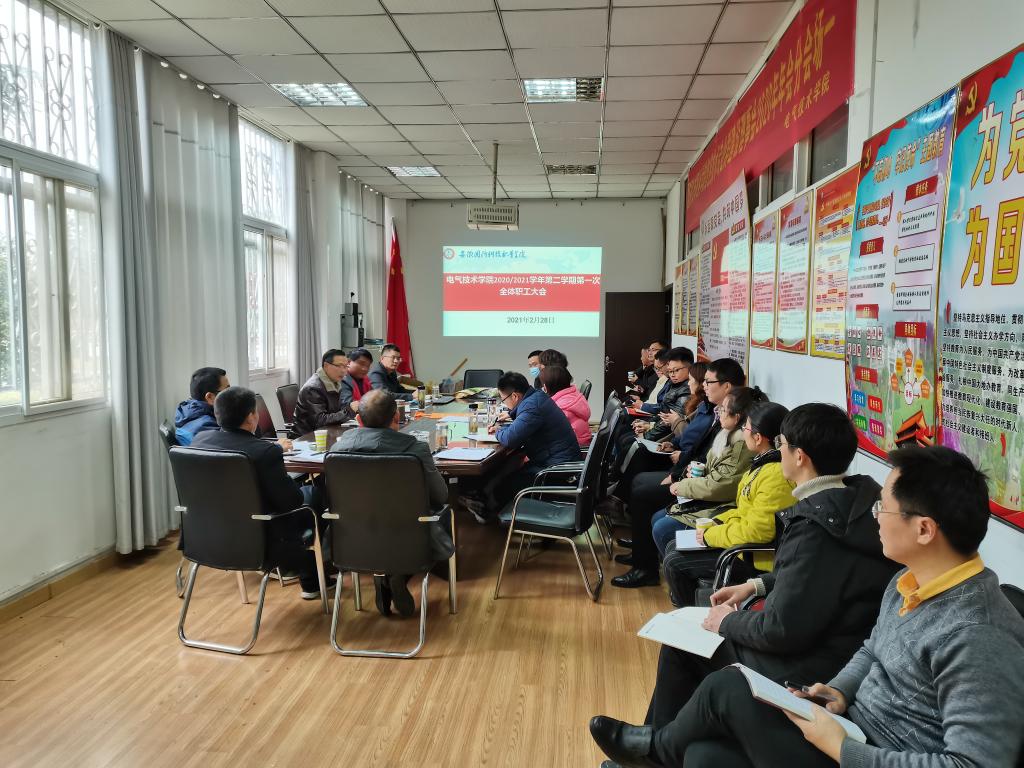本网讯(电气技术学院 史媛芳)为确保新学期各项工作顺利开展,2月28日下午,电气技术学院召开了2020-2021学年第二学期首次教职工大会,部署安排开学工作等事宜。会议由电气学院院长李翔主持,全体教职工参会。