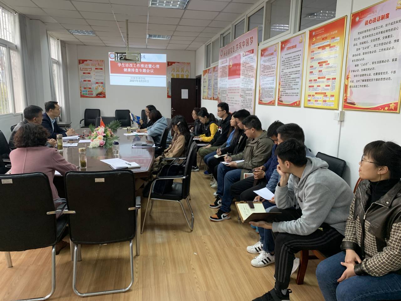 本网讯(经贸管理学院 许凤麟)根据学校工作部署,为进一步做好学生诊改工作,促进学生心理健康,3月31日,经贸管理学院召开学生诊改工作推进暨心理健康排查专题会议。党总支书记杜先扬及全体班主任参会,会议由副书记刘峰主持。