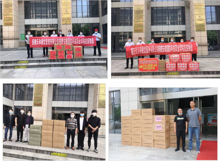 在优秀校友的带动下,在校服务企业安徽天和餐饮管理有限公司、蜀王优芙得餐饮服务有限公司、安徽长泰信息安全服务有限公司、创源物业等单位除了捐赠常规防疫物资外还捐赠了人体测温一体机等设备,助力学校疫情防控智能化,减少人与人之间接触,更加便捷的管控人员进出,做好校园疫情防控。