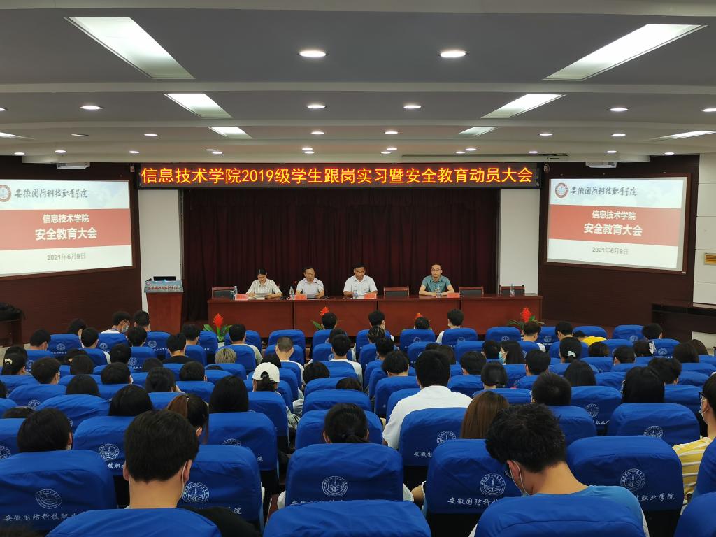 本网讯(信息技术学院 马士君)6月9日下午2:30,信息技术学院在图书馆报告厅召开了2019级学生跟岗实习暨安全教育动员大会。校党委委员、学院院长黄存东、学院党总支书记孙武、副书记杨庆颖、教学秘书李剑峰、19级各班班主任和2019级学生参加了此次大会。大会由杨庆颖主持。