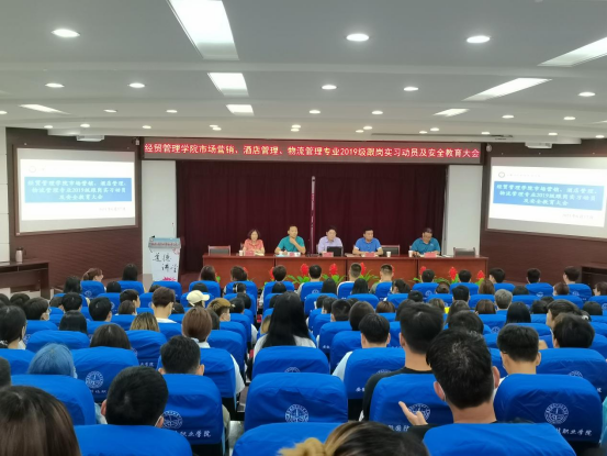 本网讯(经贸管理学院 陈玮)为促进学生跟岗实习工作的顺利开展,强化实习管理,确保实习安全,6月17日下午经贸管理学院在图书馆报告厅召开了市场营销、酒店管理、物流管理专业2019级跟岗实习动员及安全教育大会。学院党总支书记杜先扬、学院院长杨力、党总支副书记刘峰、副院长杨学分、办公室主任张圣霞、19级辅导员及班主任参加了此次大会。大会由杨学分主持。