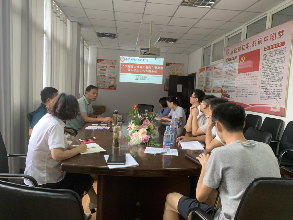 高度重视,周密安排。6月23日下午,学院党总支副书记刘峰主持召开“大起底大排查大整改”暨期末学生安全工作专题会议,认真传达学习《关于认真贯彻落实安全生产隐患大起底大排查大整改工作的通知》(校安〔2021〕4号)精神,对“大起底大排查大整改”包含的安全教育、跟岗实习学生文明离校、安全大检查等方面进行了安排。院党总支书记杜先扬要求全体学工人员时刻绷紧安全教育管理工作这根弦,要常抓不懈,要深入学生、深入学生宿舍,确保学院各项工作平稳运行。
