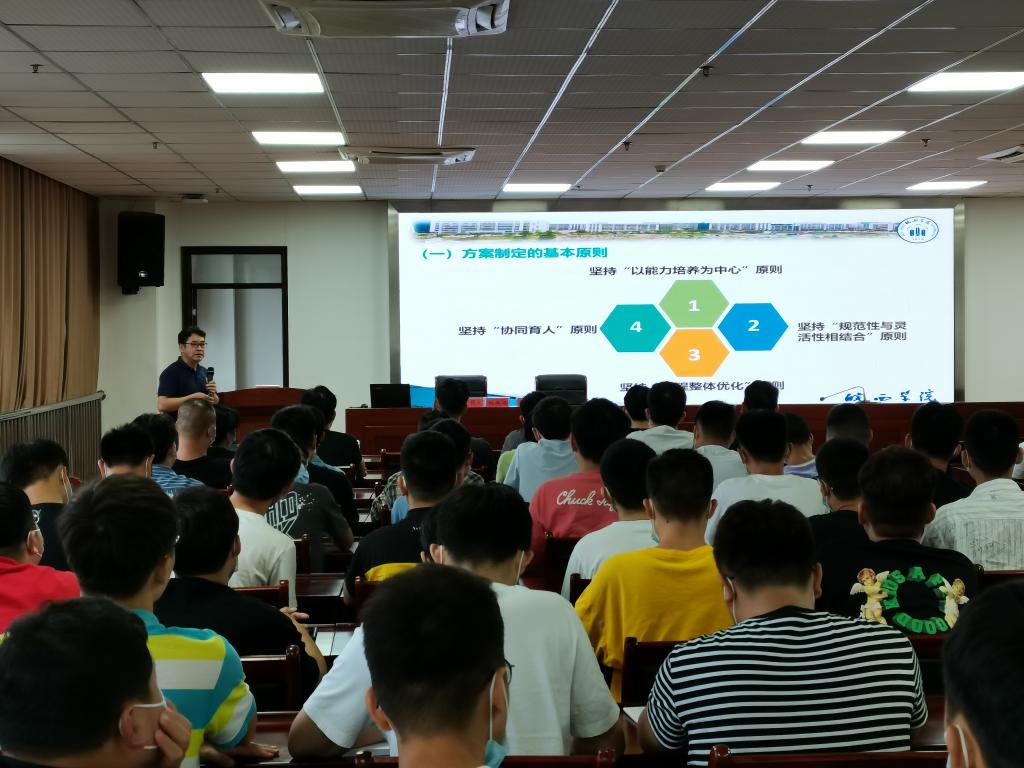 最后,皖西学院电气教研室主任杜成涛对电气工程及其自动化(专升本)专业的人才培养方案进行了细致的解读,从专业人才培养制定原则、目标与定位及培养方案的具体内容几个方面,详细介绍了专业课程体系模块、学分机制、考核评价、毕业条件等学生关注的内容。