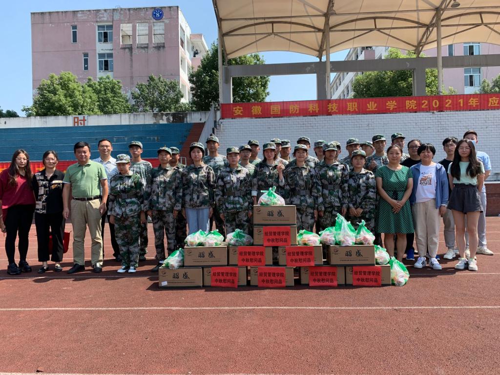 本网讯(经贸管理学院 许凤麟)在中秋佳节即将到来之际,经贸管理学院领导杜先扬、刘峰、杨学分,团总支书记付玉梅及全体2021级新生班主任辅导员深入军训训练场地看望正在军训的近六百名学生,给学生们送去慰问品,提前致以节日的问候和祝福。
