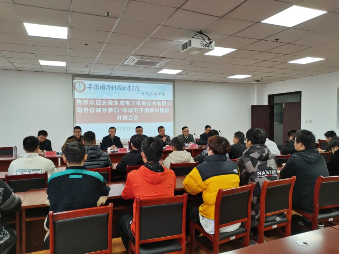 本网讯(电气技术学院 王丽)为了更好促进校企合作,培养具有创新创业精神的复合型、技能型智能控制技术方向专业人才,电气技术学院与安徽永成电子机械技术有限公司合作,决定在电气技术学院2021级(主体)和2020级学生中遴选30名学生组建“永成电子”创新兴趣小组。