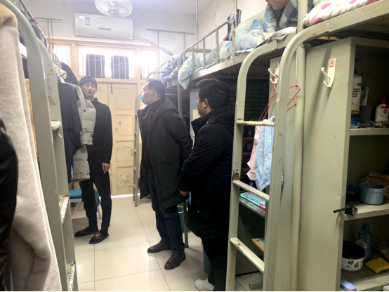 此次检查涵盖对学生宿舍内卫生、宿舍安全隐患的监管,重点检查学生宿舍是否存在使用大功率电器、使用吊床吊椅、加工食品、饮酒、吸烟、饲养动物等系列违规违纪行为以及宿舍环境卫生和常规疫情防控等各方面情况。通过检查发现,学生宿舍安全卫生情况整体良好,绝大部分学生能够做到认真遵守学生宿舍管理办法和常规疫情防控工作的相关规定和要求,针对少数存在学风不佳、卫生情况脏乱、存在安全隐患问题情况的宿舍,检查组现场引导监督学生进行了即时整改。检查过程中,刘峰书记提醒同学们抓紧时间做好期末复习备考、诚信迎考,还详细了解了同学们离校的时间、返家交通方式,提醒同学们做好离校登记,旅途中做好个人防护,回家后继续做好人身安全和疫情防控工作,不聚集,不异地流动。
