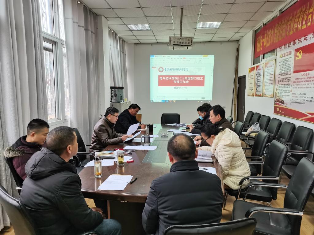 根据 《关于做好2021年度考核工作的通知》(校组人函〔2021〕71号)文件指示精神,依据《电气技术学院综合考核奖励分配办法(试行)》(校电气学院〔2019〕29号)文件具体办法及《关于成立2021年电气技术学院职工考核工作组的通知》(校电气学院〔2021〕40号 )文件安排,电气技术学院按计划组织了2021年度教职工考核系列工作,1月11日下午,专题召开了电气技术学院2021年度部门职工考核工作会议,会议由考核组组长李翔院长主持,考核工作组成员参会。