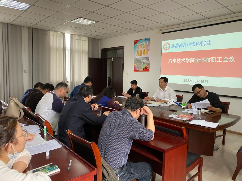 本网讯(汽车技术学院 任培培)为了进一步学习贯彻落实习近平新时代中国特色社会主义思想,传达落实上级文件精神和学校有关会议精神,部署关于疫情防控和教育教学等重要安排,3月16日下午,汽车技术学院组织召开全体教职工会议。会议由党总支书记、院长孙良平主持,全体教职工参加会议。