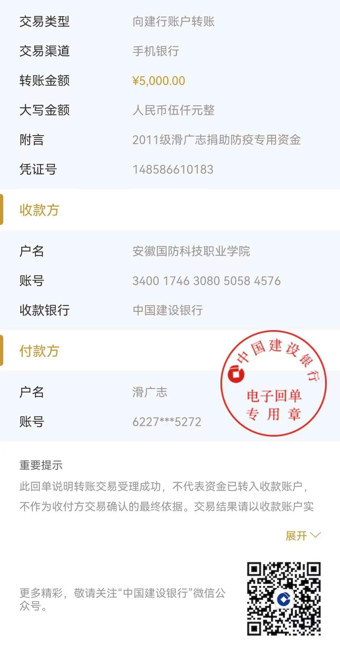 六安突发疫情,牵动着学院毕业学子的心。2014届毕业生滑广志,在得知六安市疫情形式严峻后,第一时间与学院付玉梅老师取得联系,捐款5000元用于母校疫情防控工作。滑广志在校期间学习努力,成绩优异,曾担任管理工程系第七届学生会主席,多次获得奖学金、励志奖学金,现在阜阳市创业,吃水不忘挖井人,懂得感恩母校,回报社会,彰显了经贸学子的责任与担当。