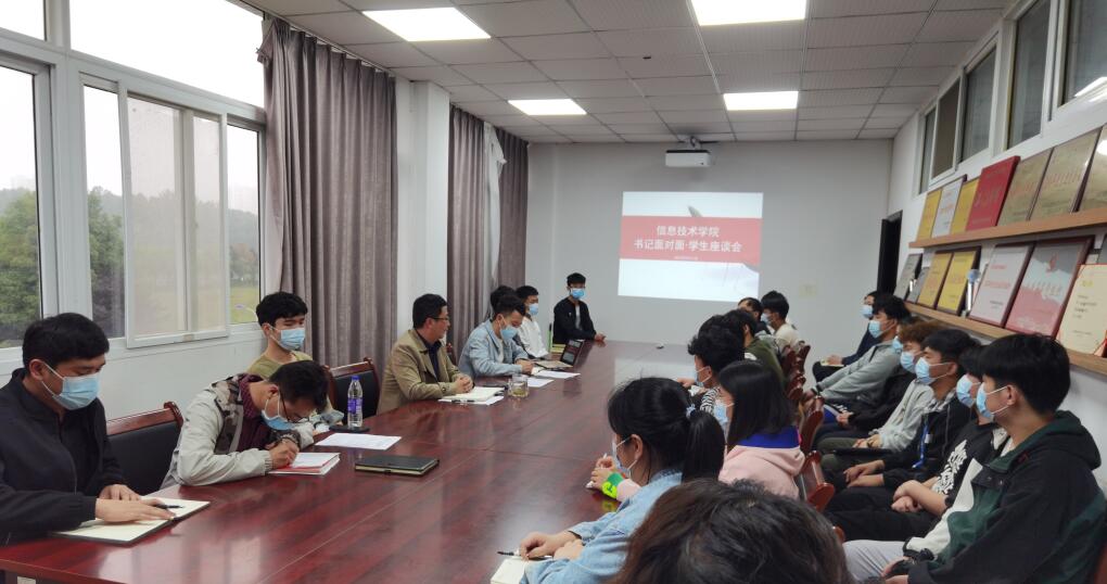本网讯(信息技术学院 孙颖凯)为深入贯彻落实校“两案九制”文件精神,做好疫情防控期间校园日常的管理工作,加深学院师生之间的沟通交流。5月11日下午,信息技术学院在知行楼304会议室召开“书记面对面”师生座谈会,院党总支书记王胜出席座谈会,辅导员黄双河、韦志魁及院学生会近30名主要学生干部参加会议,会议由院团总支书记孙颖凯主持。