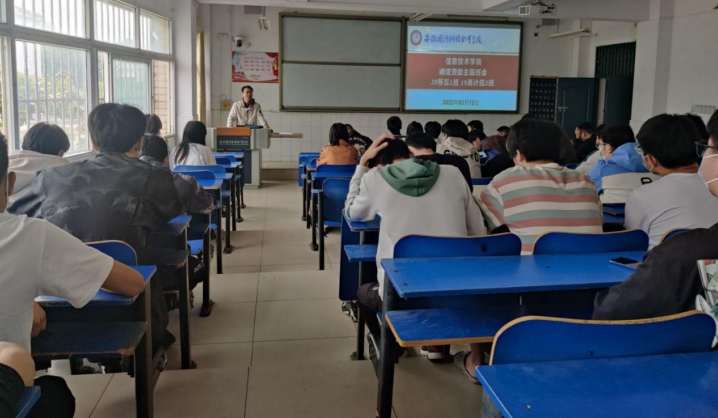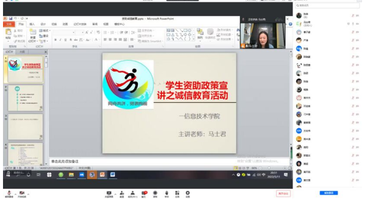 5月11日下午,信息技术学院召开全体班主任会议,学院党总支书记王胜对做好学生资助诚信教育主题班会做了详细的部署。5月11日至5月17日,学院全体班主任按照要求,克服疫情影响,通过线上与线下相结合的方式,有序开展主题班会。各位班主任把当下的疫情形势与学生资助相结合,通过一张张PPT,详细的讲解国家对于大学生的关爱和关怀,生动的阐述了“学生资助”与“诚信”之间的相互关系。