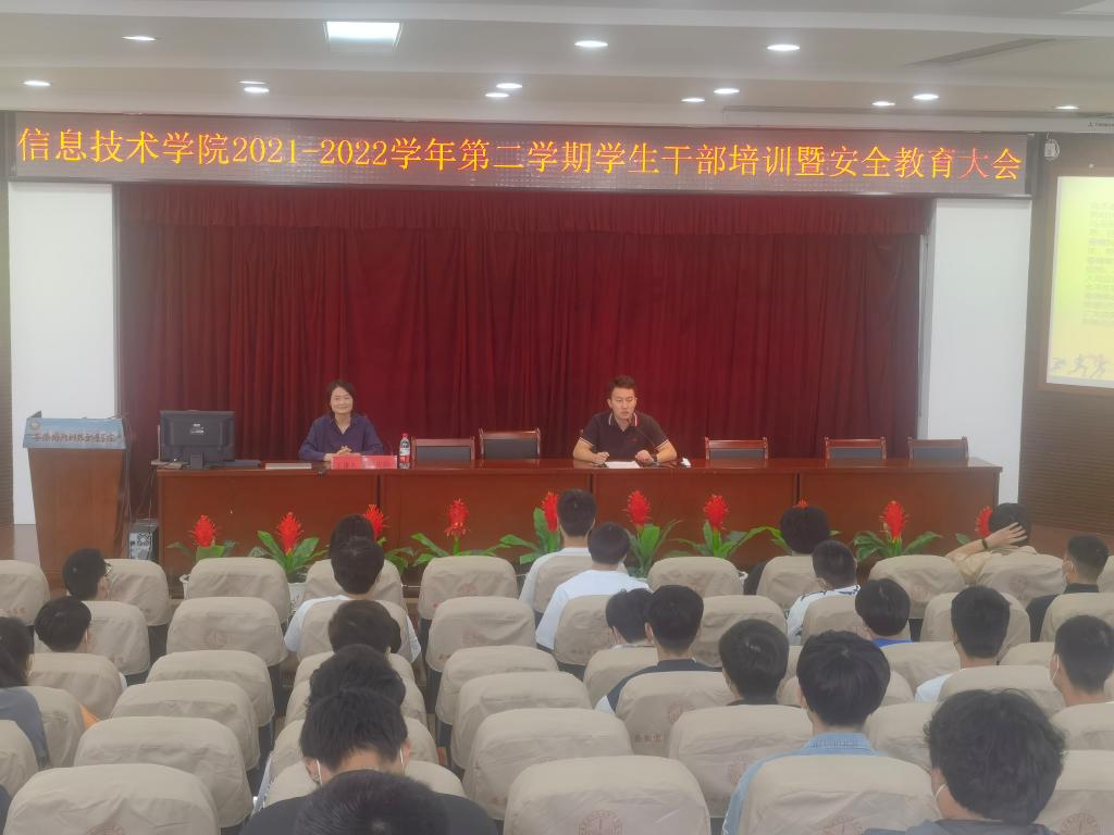 本网讯(信息技术学院 孙颖凯)为增强院学生干部的大局意识、服务意识、责任意识,增强学生干部的整体素质,以便更好地服务于学院师生,同时进一步加强学院学生安全教育工作,强化和引导学生自觉遵守校纪校规。5月21日上午,信息技术学院在图书馆报告厅召开了信息技术学院2021-2022学年第二学期学生干部培训暨安全教育大会,学院党总支副书记杨庆颖为学院学生干部做培训报告,会议由学院团总支书记孙颖凯主持。
