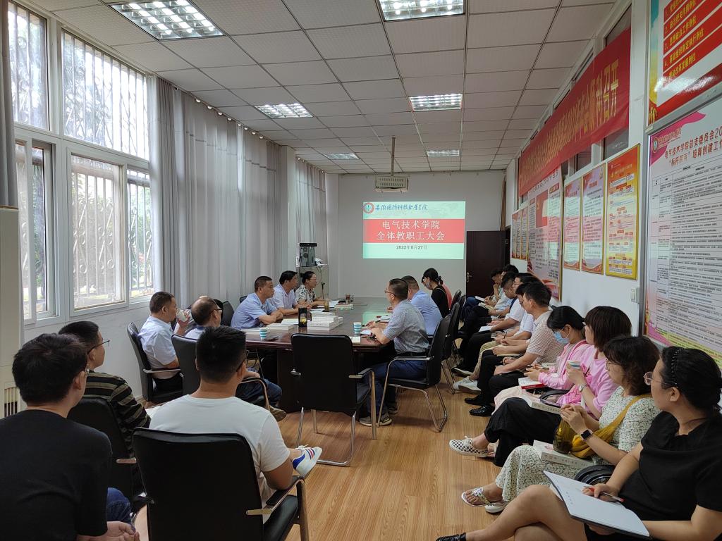 本网讯(电气技术学院 程坤)8月27日下午电气技术学院在知行楼106会议室召开全体教职工大会,传达学习学校2022年暑期中层干部培训班精神及学校秋季学期开学工作方案,部署学院新学期工作,电气技术学院党总支书记叶启衡主持会议。
