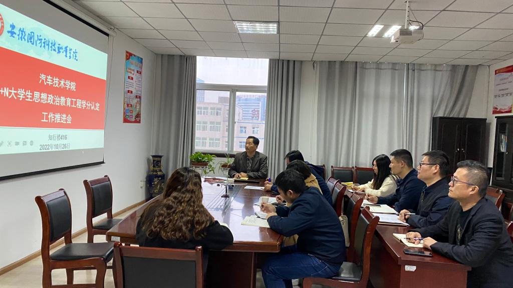 本网讯(汽车技术学院 陈梦雅)为进一步把贯彻落实《中共中央国务院关于加强和改进新形势下高校思想政治工作的意见》和《高校思想政治工作质量提升工程实施纲要》文件精神,提升学校思想政治工作质量,着力培养德智体美劳全面发展的社会主义建设者和接班人,汽车技术学院于10月26日下午在会议室召开“1+N”大学生思想政治教育工程学分认定工作推进会,汽车技术学院党总支书记兼院长孙良平、党总支副书记余桂刚及全体班主任参加会议。