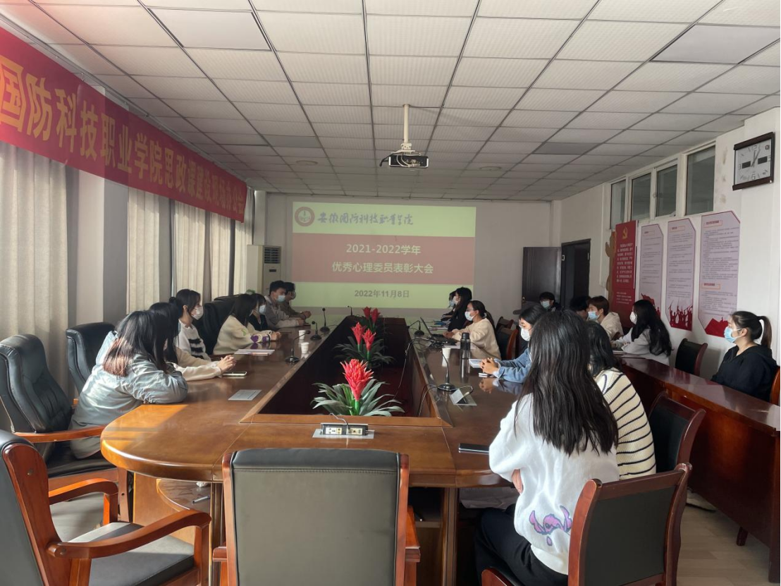 本网讯(马克思主义学院 费思佳)为了加强班级心理委员管理,表彰先进,树立典型,11月8日中午,心理健康教育中心在知行楼403会议室召开2021-2022学年优秀心理委员表彰大会,会议由心理健康教育中心主任戴柳主持,心理咨询员费思佳和受表彰的优秀心理委员参加了会议。