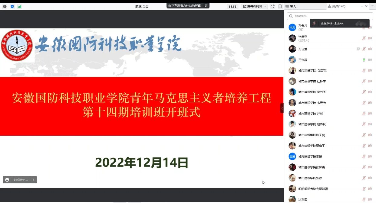 本网讯(校团委 罗丞筠)为深入学习贯彻习近平新时代中国特色社会主义思想和党的二十大精神,认真贯彻落实习近平总书记关于青年工作的重要思想,加强青年学生骨干的培养,着力造就一批对党忠诚、信仰坚定、素质优良、作风过硬的青年马克思主义者。学校第十四期“青年马克思主义者培养工程”培训班于12月15日通过钉钉会议形式举行开班式。校团委副书记张凤,各二级学院团总支书记、团委老师以及149名青马学员参加了开班式。会议由素质拓展中心主任罗丞筠主持。