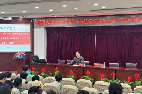 本网讯(汽车技术学院 陈梦雅)为进一步提高汽车技术学院学生干部的综合素质和业务水平,根据《关于举办2023年下半年汽车技术学院学生干部培训班的通知》文件安排,11月24日下午,汽车技术学院党总支书记、院长孙良平开启培训第一讲,就“如何做好一名学生干部”做专题讲座,汽车技术学院在校班级全体班委、团总支学生会及社团学生干部参加培训。