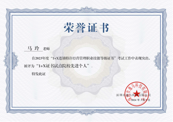 本网讯(经贸管理学院 马玲)日前,教育部第三方培训评价组织逸马连锁教育集团公布了2023年度“1+X连锁经营管理职业技能等级证书”考试工作中表现突出的先进单位及个人名单。beat365在此项考核中脱颖而出,荣获“模范考核站点”殊荣。同时,beat365经贸管理学院被评为“1+X证书试点院校优秀组织单位”,市场营销专业的马玲老师荣获“1+X证书试点院校先进个人”称号。