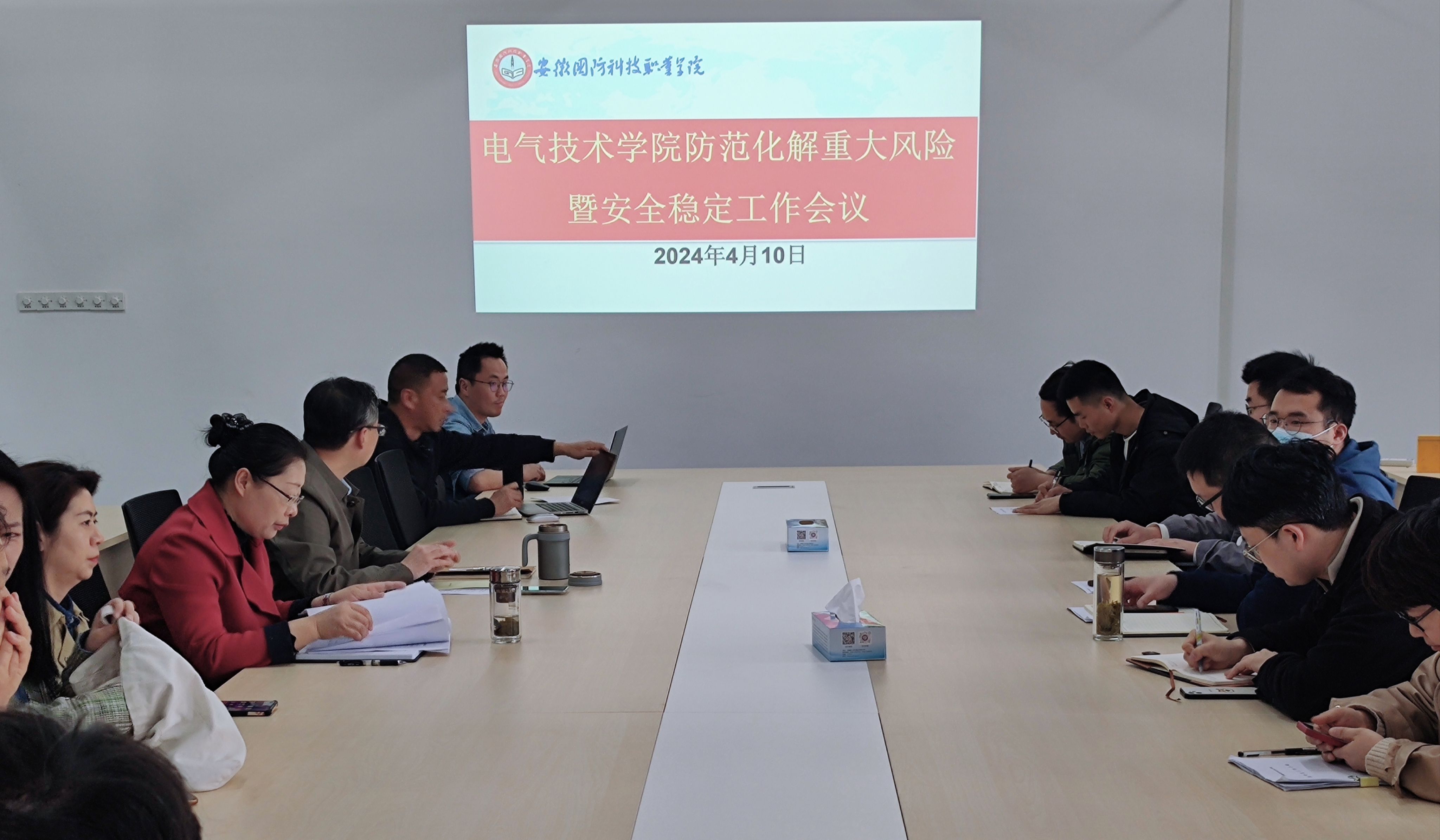 本网讯(电气技术学院 卢明瑞)为进一步做好安全稳定和风险防范工作,4月10日下午,电气技术学院防范化解重大风险暨安全稳定工作会议在秉心楼3楼会议室召开,电气技术学院全体教职工参加会议,会议由电气技术学院副书记张丽主持。