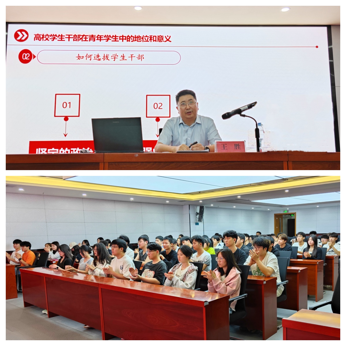 王胜围绕党和国家对青年发展的重视,高校学生干部在青年学生中的地位和意义展开,强调高校学生干部应把握新时代的使命和担当,应该时刻秉承着有理想,有本领,有责任,有担当的信念。嘱咐青年学子身逢强国时代,更应肩负强国使命,心中有阳光,脚下有力量,提高政治站位,树立底线思维,在学生干部岗位上力争勇闯善干,扬起青春征程的船帆。