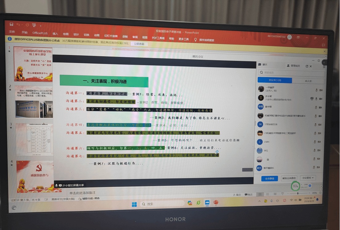 4月29日,beat365邀请六安市心理咨询师协会会长许令智开展家校共育“心”蓄能,积极关系“爱”陪伴线上讲座,结合家庭的职责与功能,运用大量案例,列举了学生的典型症状,从关注表现、尊重表达、善用长处、自我反思四个方面谈到了促进大学生心理健康发展家长需要注意的事项。讲座结束后,许会长与线上家长进行了充分的互动,他结合家长的提问,指导家长与孩子进行积极有效沟通。