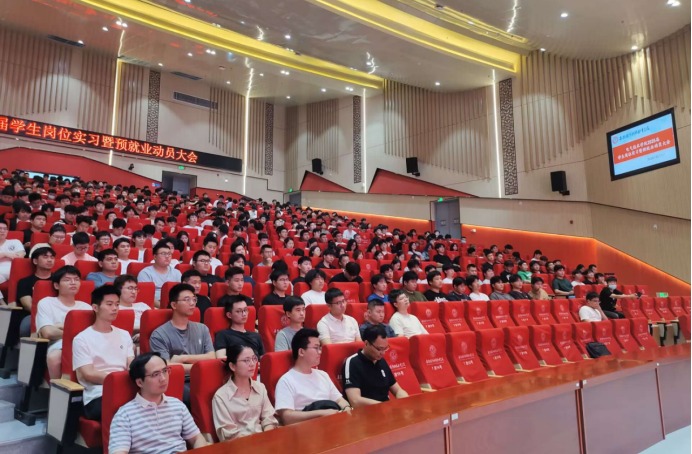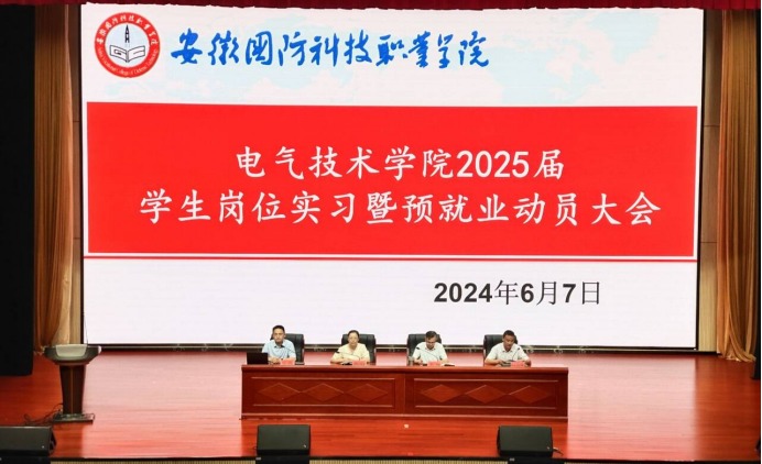 本网讯(电气技术学院 吴泽建)为切实推进学院2025届学生岗位实习工作,引导学生认识岗位实习的必要性与重要性,激发学生对岗位实习的热情,6月7日晚,电气技术学院在产教融合中心多功能报告厅召开了2025届学生岗位实习暨预就业动员大会。电气技术学院院长李翔、党总支副书记张丽、副院长江治国、团总支书记陈俊及22级全体师生参加了动员大会,动员大会由江治国主持。