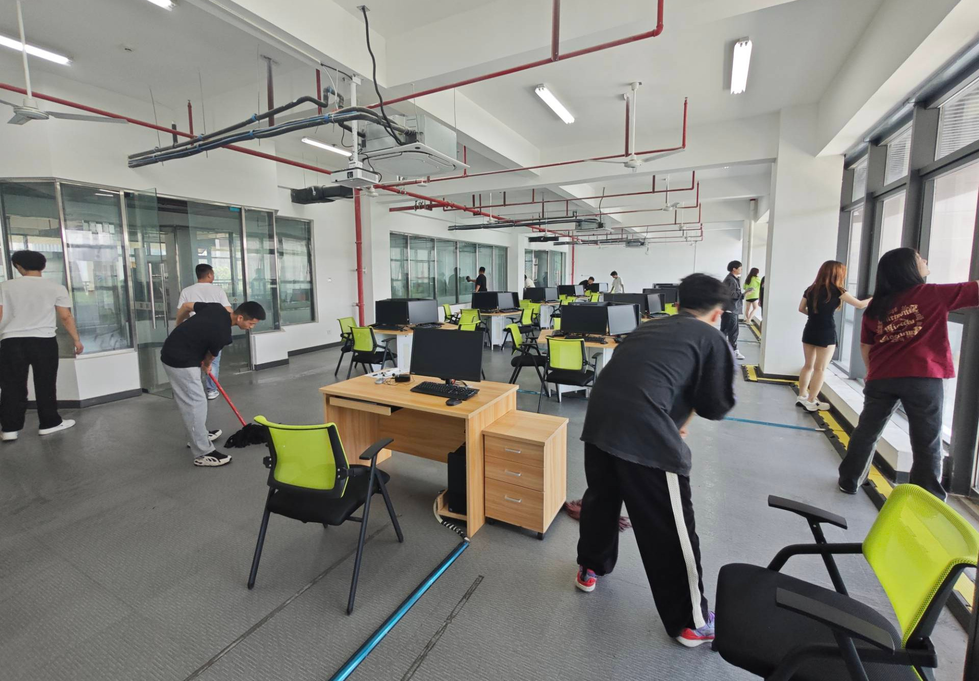活动中,党员与入党积极分子们热情高涨,纷纷拿起清洁工具,投入到紧张而有序的打扫中。他们分工明确,有的负责扫地拖地,有的负责擦拭桌椅设备,有的则负责整理实训器材。在大家的共同努力下,原本略显凌乱的实训室焕然一新,变得干净整洁、井井有条。