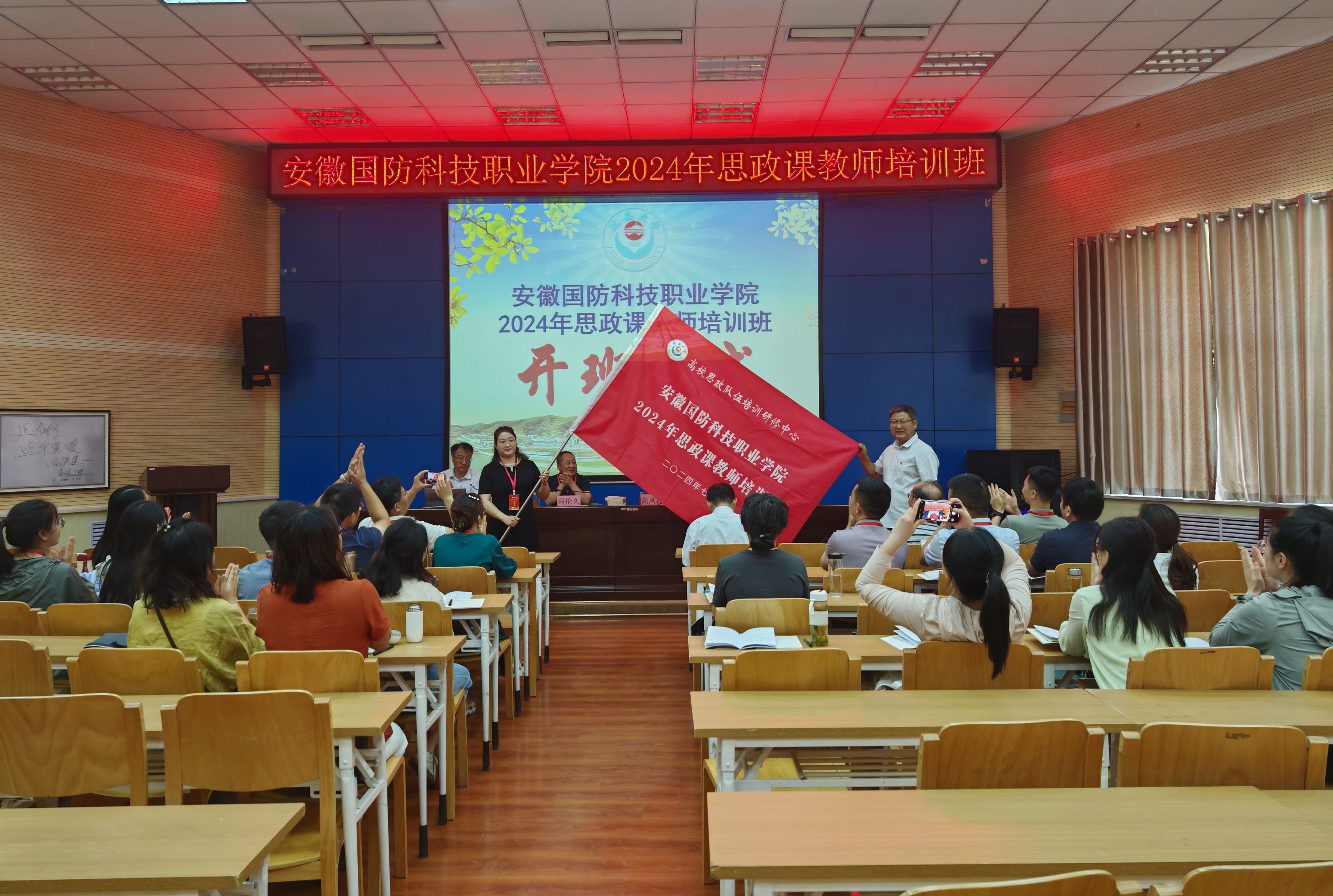 7月2日上午,培训班开班仪式在延安大学路遥报告厅举行。开班仪式由本期培训班班主任周庆丰主持,教育部高校思想政治工作队伍培训研修中心(延安大学)办公室主任、马克思主义学院副院长高凤林教授出席仪式并致欢迎辞。他希望学员们能够学好用好延安精神,为高校思想政治工作贡献智慧和力量。随后进行授旗仪式,马克思主义学院院长陈思代表全体学员接旗。