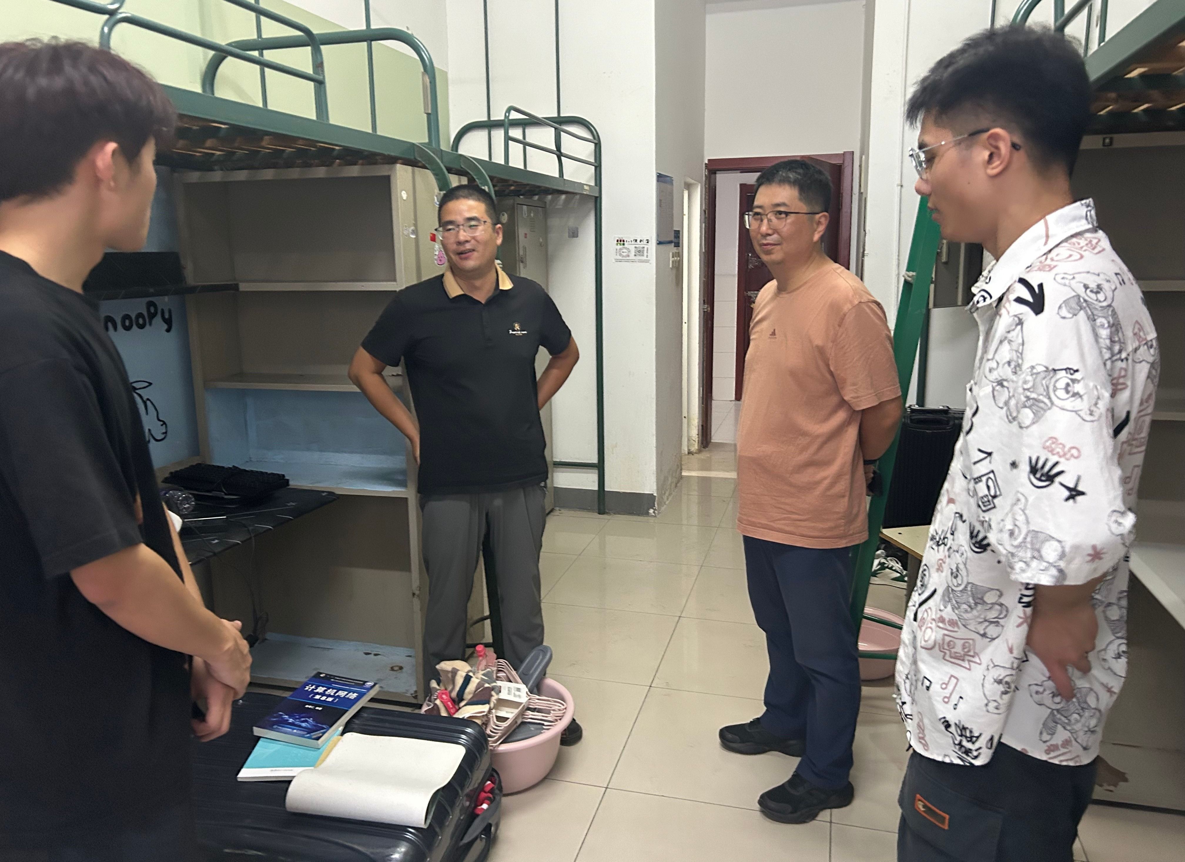 走访中,王胜与近日报到的本科班同学们进行亲切交流,询问学生对校园生活的适应度,宿舍环境与新生服务的满意度,鼓励新生积极参与学院活动,气氛和谐融洽,并向新生强调要保护个人财产安全,谨防电信诈骗,遵守校规校纪,特别是宿舍消防管理规定。辅导员老师们细心询问老生假期学习情况、开学准备情况等,希望同学们保持健康愉悦的心情,尽快进入学习状态。就同学们较为关心的相关事项逐一解答,引导教育学生参与文明宿舍、文明校园创建,详细宣讲学生个人安全防范、冬春季传染病防治、防电诈等方面的知识;叮嘱同学们遵守宿舍管理规定、消防安全、保持寝室卫生干净整洁,以宿舍为单位,做好通风消杀,物品规整,妥善做好宿舍搬迁工作。