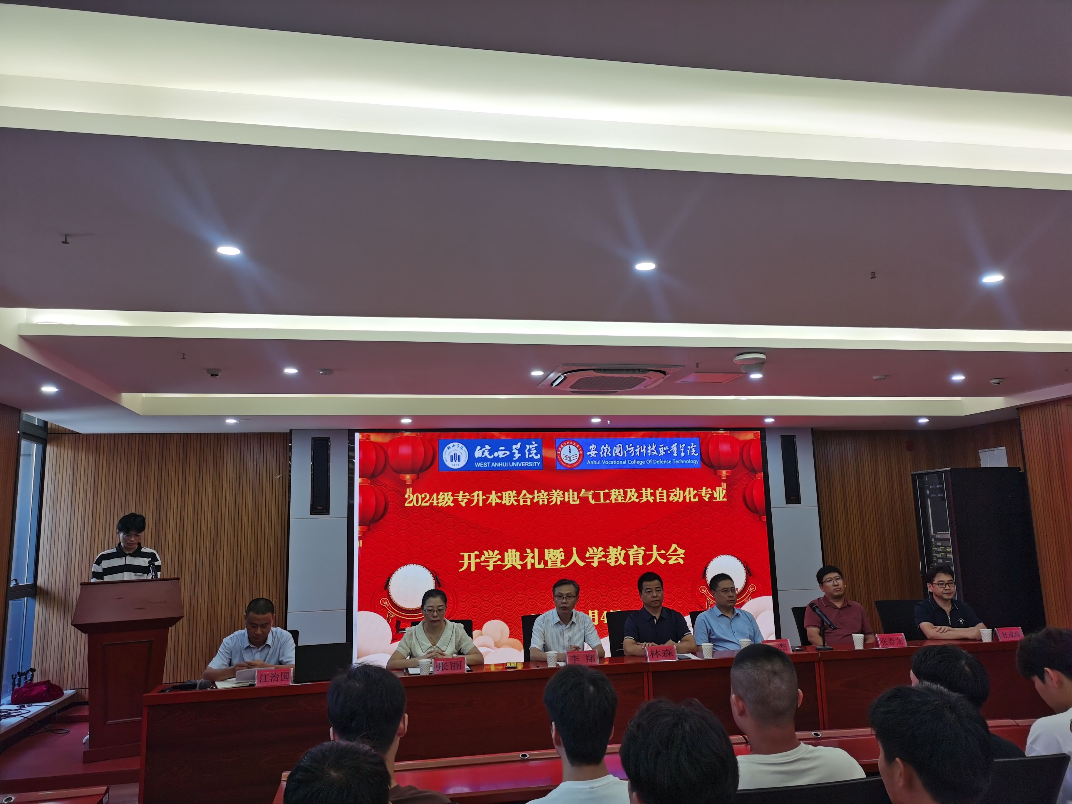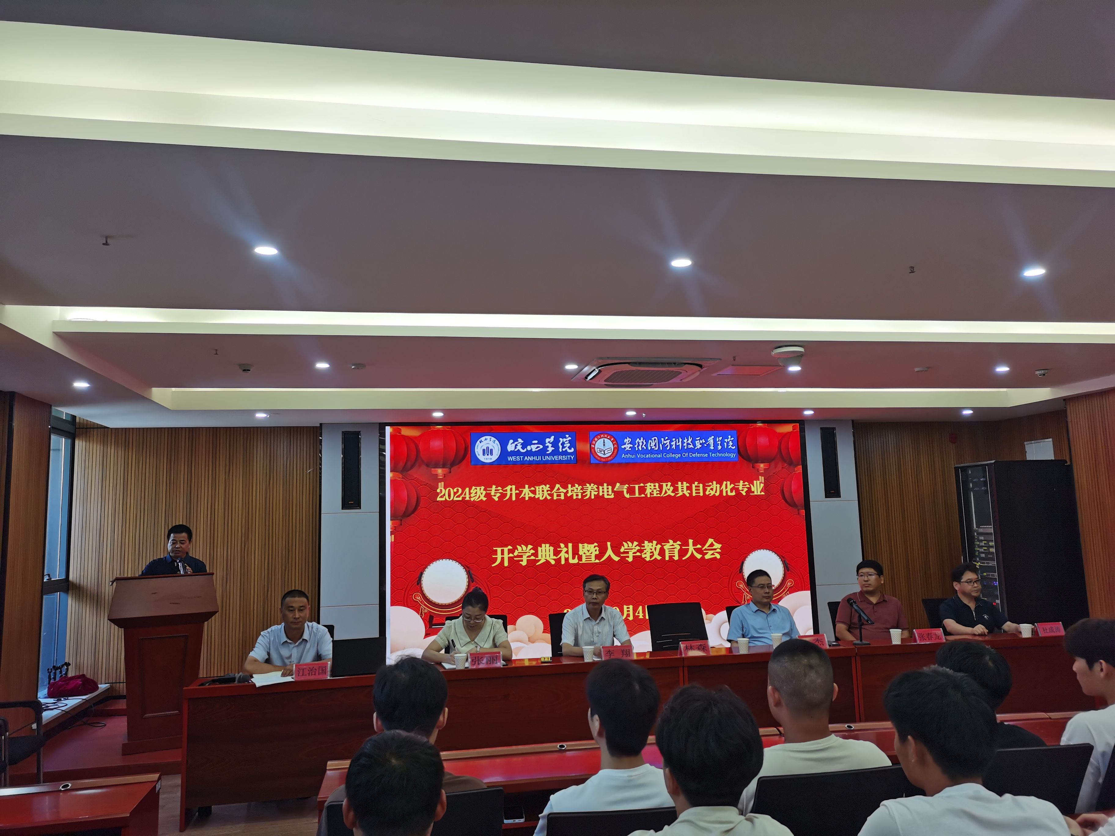 本网讯(电气技术学院 江治国)9月4日下午,电气技术学院组织召开了2024级专升本联合培养电气工程及其自动化专业开学典礼暨入学教育大会。皖西学院电气与光电工程学院党委书记林森、院长方杰、副院长张春龙、电气工程及其自动化专业带头人杜成涛,beat365唯一官方网站电气技术学院院长李翔、党总支副书记张丽、电气自动化技术专业负责人任汉鼎、部分教师以及2024级本科班全体同学参加了会议,会议由电气技术学院副院长江治国主持。