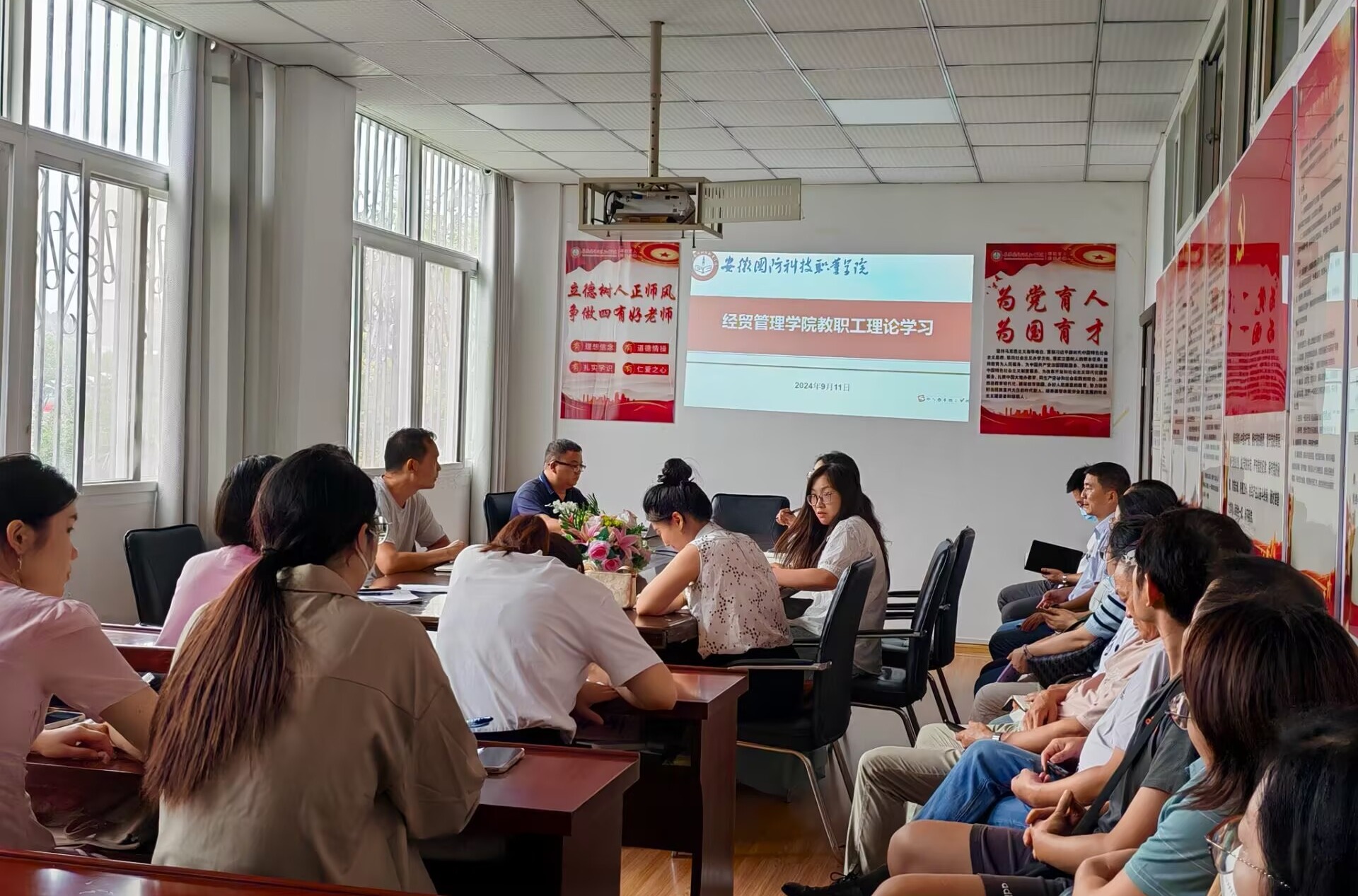 本网讯(经贸管理学院 付玉梅)根据工作部署,9月11日,经贸管理学院召开全院教职工学习活动,学习贯彻全国教育大会精神,持续加强师德师风建设,活动由院党总支书记刘峰主持。